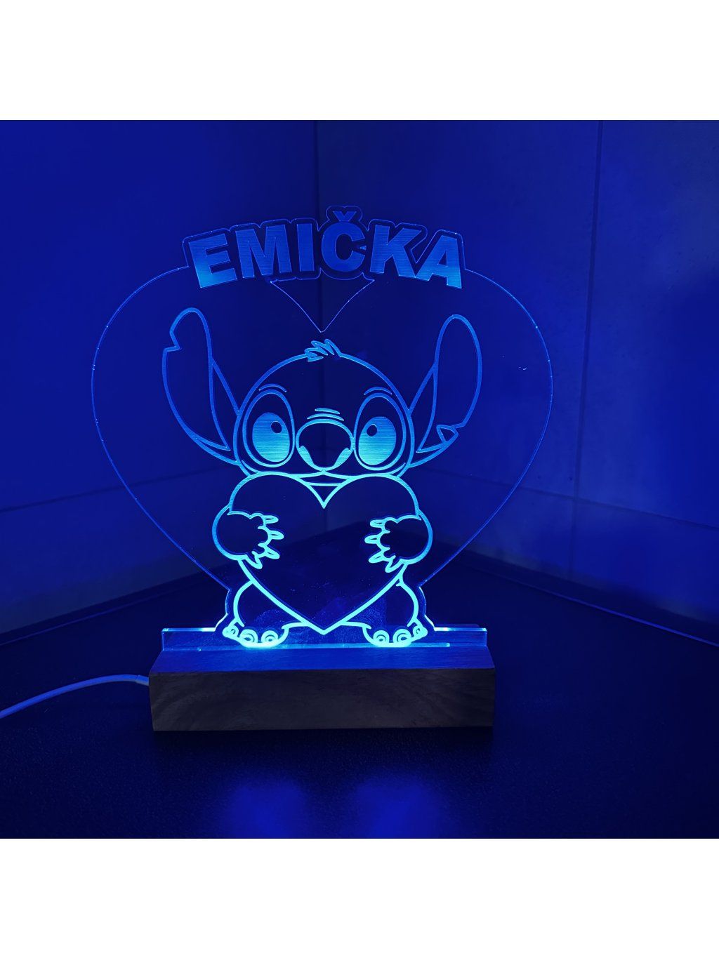 Lampička svítí všemi barvami, dřevěný podstavec s vypínačem USB napájení.