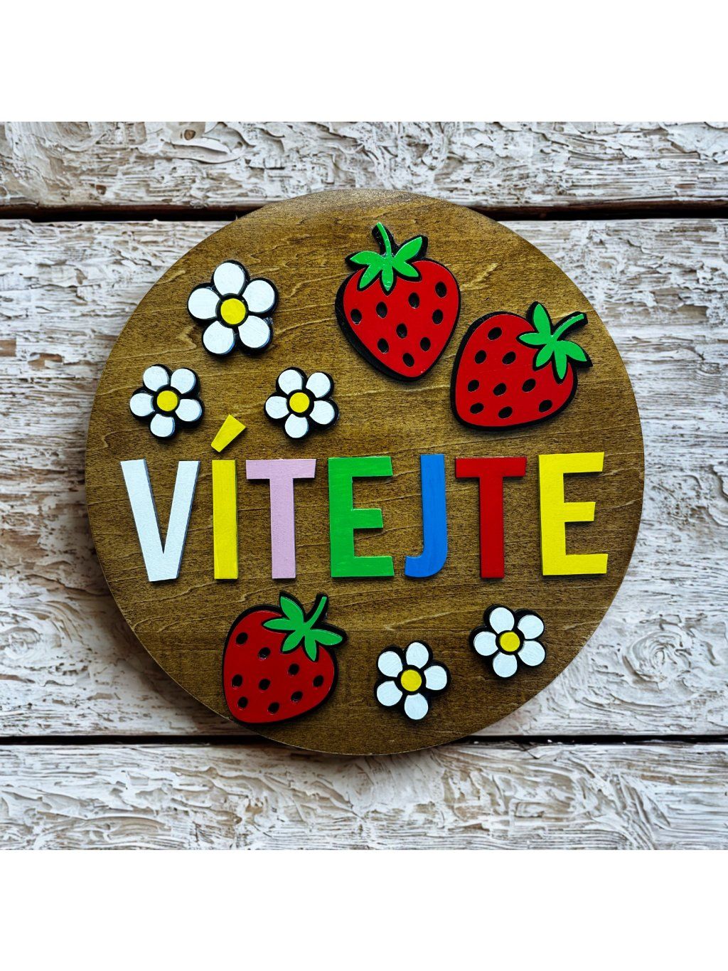 Přivítejte své hosty stylově s touto originální dřevěnou dekorací na dveře s nápisem „Vítejte“. Veselý design s jahodami a květinami vnese do vašeho domova svěží jarní a letní atmosféru.