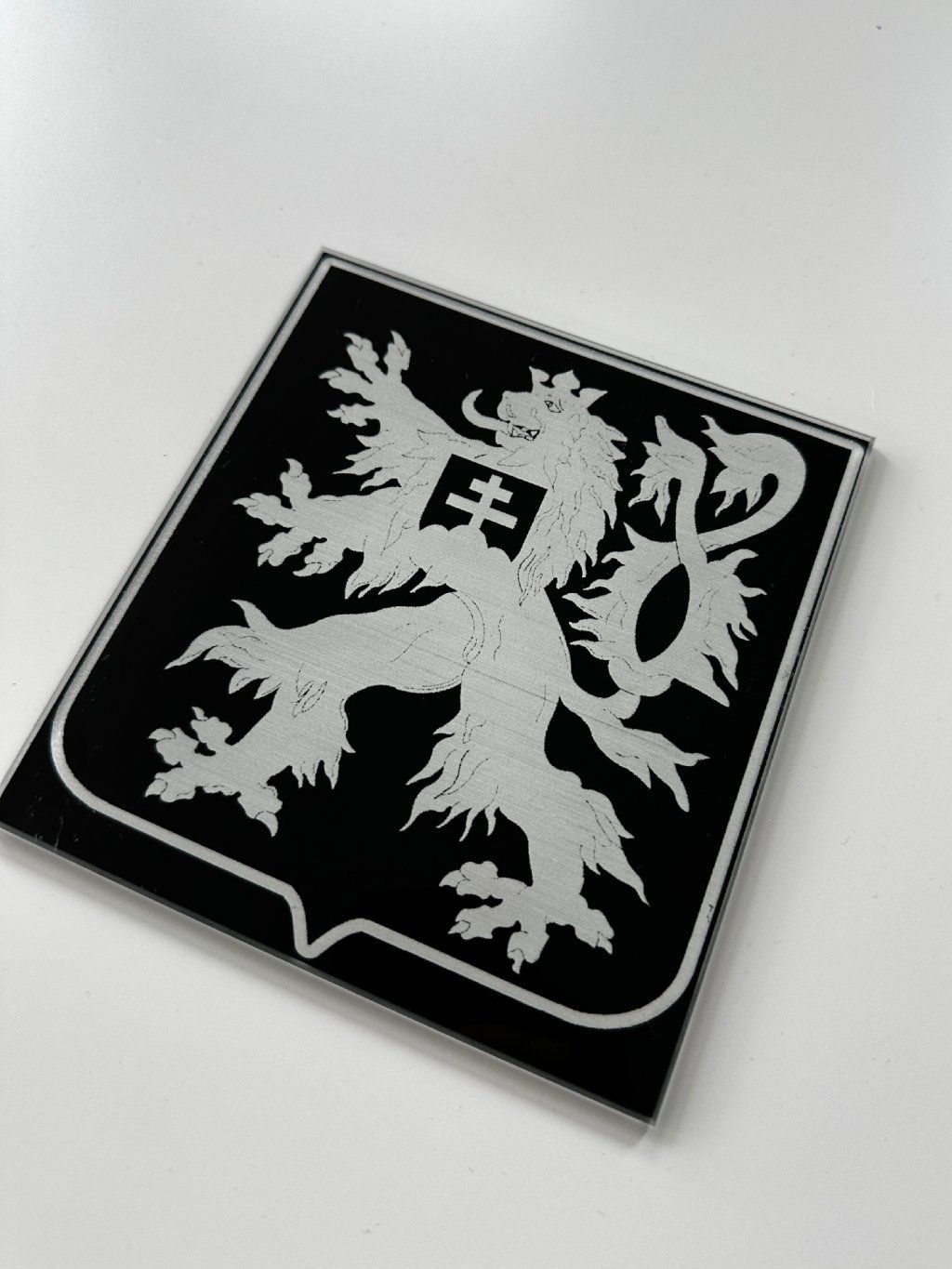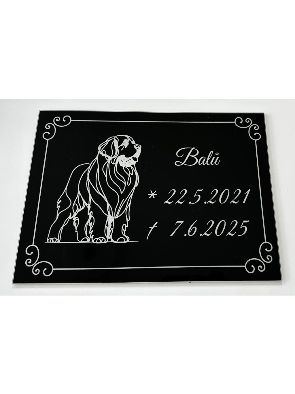 Cedule je vyrobena z kvalitního černého skla a její maximální rozměr je 40 × 30 cm. Každý kus je originál – text, motiv i rozvržení přizpůsobujeme vašim přáním.
